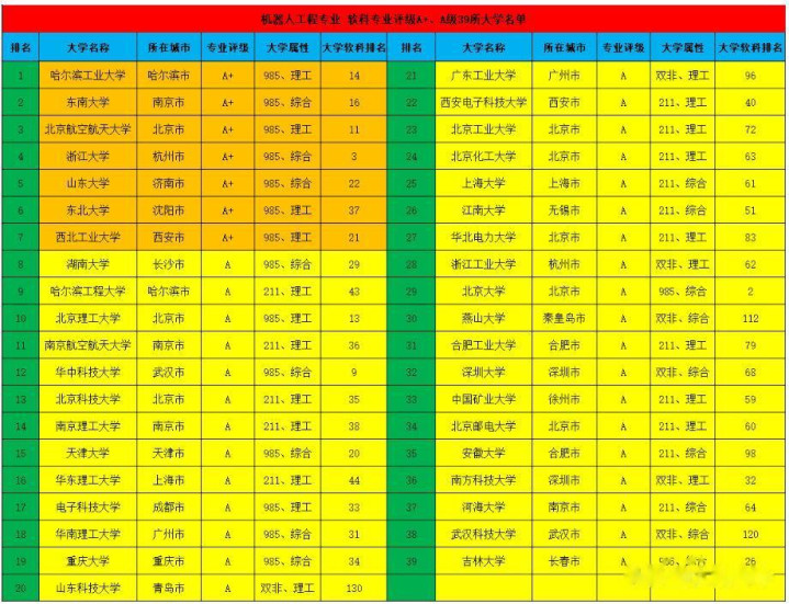 2、根据2025年软科中国大学专业排名资料显示,机器人工程专业评级排名中,共有197所大学进入评级排名榜单,分成A+、A、B+、B等4个等级,具体数量分布为:A+级7所、A级32所、B+级80所、B级78所。本文介绍A+级和A级共39所大学的地区分布、大学层级、参考软科排名。希望对于选择报考机器人工程专业的朋友有一定的帮助和参考作用。A+级和A级39所大学,具体地区分布数量和大学分类参考排名情况列表如下(部分大学排名并列,具体顺序仅供参考):