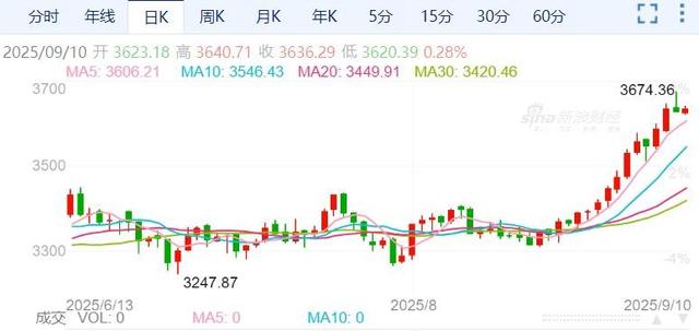9月9日,金价延续涨势,盘中再创历史新高,因市场普遍预期美联储将在9月降息。投资者同时关注本周即将公布的美国通胀数据。现货金上涨0.2%,报每盎司3643.57美元,盘中一度触及纪录高位3674.36美元。
